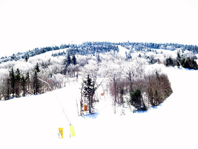 For our warm up run, we got off American Express and skied back down, bypassing Ursa Access. The snow was quite soft and deep already and getting fairly wet and heavy. For our second run, we went all the way to the top and conditions were much better. It was absolutely gorgeous at the top; a winter wonderland. The trees laden with fresh snow. It looked like the deep of winter but was close to 40 degrees. It's very picturesque up there with all the signs pointing out the trails and lodges; like a little village on top of the mountain.